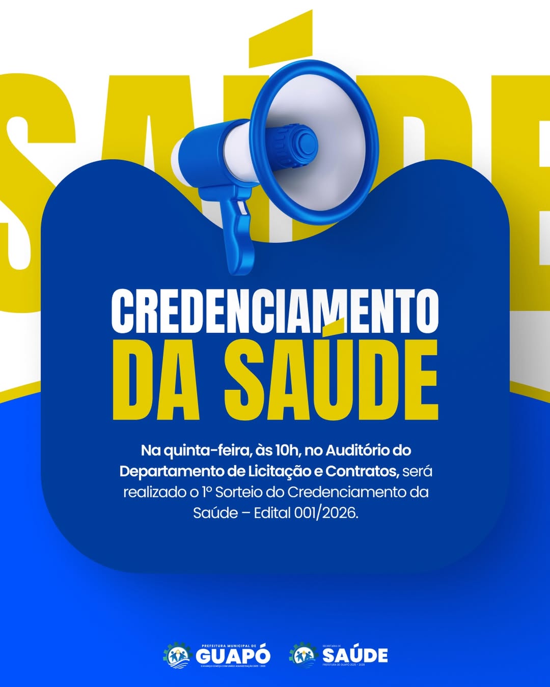 Na quinta-feira, às 10h, no Auditório do Departamento de Licitação e Contratos, será realizado o 1º Sorteio do Credenciamento da Saúde – Edital 001/2026.